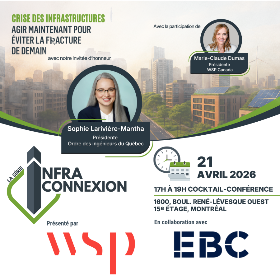 La Série Infra-Connexion amorce l’année 2026 avec une invitée d’honneur de marque qui partagera sa lecture des enjeux actuels et futurs de notre industrie. Cette soirée sera aussi l’occasion de valoriser le leadership féminin et de souligner la contribution essentielle des femmes en infrastructures.